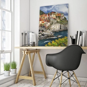 Das Gemälde „Bunte Stadt auf einer Klippe am Meer“ ist eine atemberaubende Komposition, die eine malerische Landschaft mit bunten Städten zeigt, die auf einer Klippe direkt über dem blauen Wasser liegen. Diese einzigartige Ansicht verweist auf die wunderschönen Orte der Cinque Terre, die mit ihrer Einzigartigkeit und ihrem Charme begeistern.