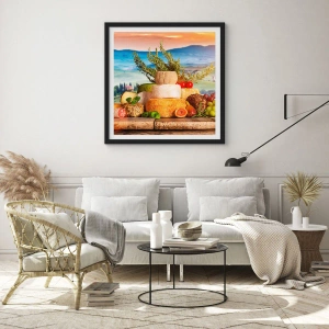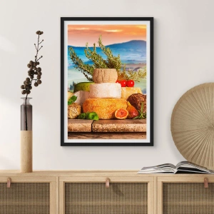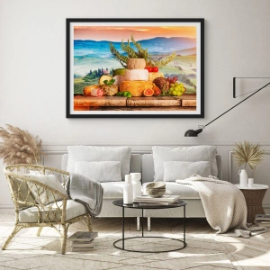Poster in einem schwarzem Rahmen - Eine Komposition aus Käse und Früchten vor der Kulisse der toskanischen Landschaft - 70x50cm - Die italienische Lebensfreude - Moderne Wanddekoration für Wohnzimmer und Schlafzimmer ARTTOR
