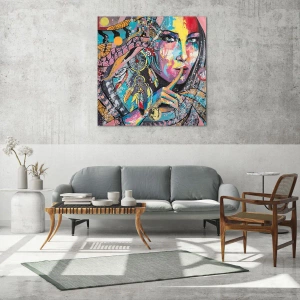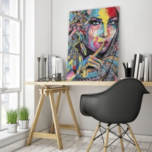Das Glasbild "Farbenfrohes Frauenporträt" ist eine äußerst ausdrucksstarke und künstlerische Komposition, die ethnische Motive, bunte Muster und zarte Federdetails kombiniert. Das in intensiven und abwechslungsreichen Farben gehaltene Frauenporträt bringt Harmonie, Energie und Ausdruckskraft in den Innenraum.