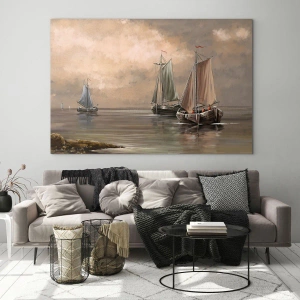 - Das Gemälde zeigt drei Segelboote, die auf einer ruhigen See treiben, umgeben von dünnen Wolken. Dezente Pastelltöne und Spiegelungen auf dem Wasser verleihen der Komposition eine nostalgische und romantische Atmosphäre.