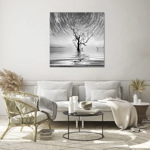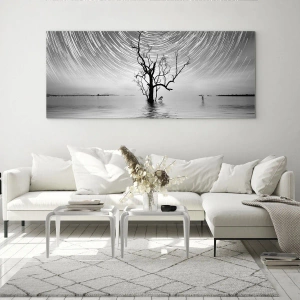 Glasbild - Bild auf glas - Schwarz-weiße Landschaft mit einem Baum und Sternenstreifen - 70x50cm - Eine Sinfonie der Natur - Moderne Wanddekoration für Wohnzimmer und Schlafzimmer ARTTOR