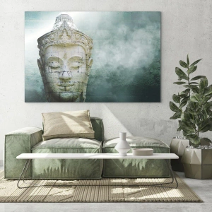 Der grüne Hintergrund des Gemäldes verweist auf die Natur und betont ihre Nähe und Ausgeglichenheit. Die zarten Details der Buddha-Statue verleihen Eleganz und schaffen eine raffinierte Dekoration, die perfekt zu orientalischer Inneneinrichtung passt.