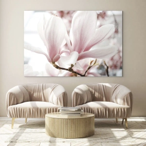 Glasbild - Bild auf glas - Zarte rosa Magnolien in Nahaufnahme vor unscharfem Hintergrund - 70x50cm - Eine Fülle von Zärtlichkeit - Moderne Wanddekoration für Wohnzimmer und Schlafzimmer ARTTOR