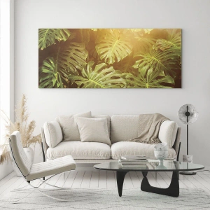 Glasbild - Bild auf glas - Grüne Monstera-Blätter im goldenen Licht der tropischen Sonne - 70x50cm - Ins Grüne tretren... - Moderne Wanddekoration für Wohnzimmer und Schlafzimmer ARTTOR