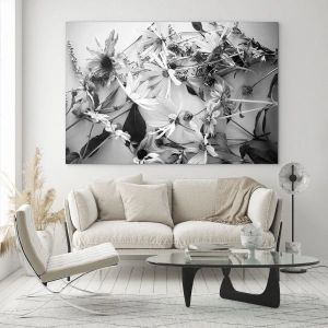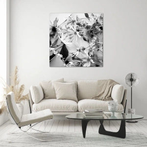 Glasbild - Bild auf glas - Verstreute schwarz-weiße Blumen in einem kunstvollen Arrangement - 70x50cm - Kein Blumenstrauß - Moderne Wanddekoration für Wohnzimmer und Schlafzimmer ARTTOR