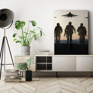 - Ein Gemälde, das die Silhouetten von Soldaten und Kampfjets vor dem Hintergrund eines Sonnenuntergangs zeigt. Eine Komposition voller Kraft und Entschlossenheit, perfekt für moderne Innenräume im Militärstil.