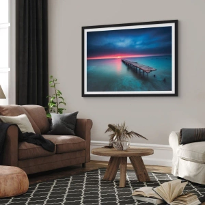 Poster in einem schwarzem Rahmen - Ein Holzsteg, der bei Sonnenuntergang direkt aufs Meer hinausführt - 70x50cm - Zwischen Himmel und Erde - Moderne Wanddekoration für Wohnzimmer und Schlafzimmer ARTTOR