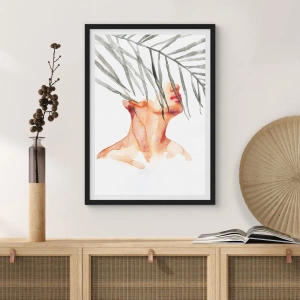 - Das Poster zeigt ein Aquarellporträt einer Frau, deren Gesicht teilweise von Palmblättern verdeckt wird. Die subtile Komposition und die Pastellfarben unterstreichen die Zartheit und Harmonie des Bildes.