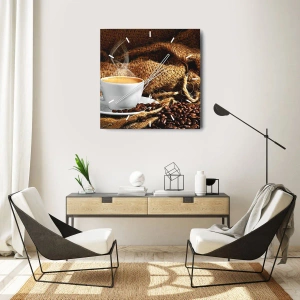 Wanduhr - Glasuhr - Eine Tasse Kaffee, umgeben von einer Tüte Kaffeebohnen - 30x30cm - Der Geruch von Mokka und die Dicke der Honigflüssigkeit - Moderne Wanddekoration für Wohnzimmer und Schlafzimmer ARTTOR