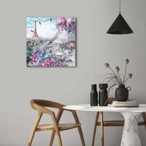 Die Wanduhr „Am schönsten ist es hier im Mai“ ist voller Charme und Subtilität, die Liebhaber von Paris und romantischer Atmosphäre begeistern wird. Das Motiv einer malerischen Terrasse mit Blick auf den Eiffelturm, umgeben von blühenden Blumen, schafft eine Atmosphäre von Frieden und Frühlingsfreude.