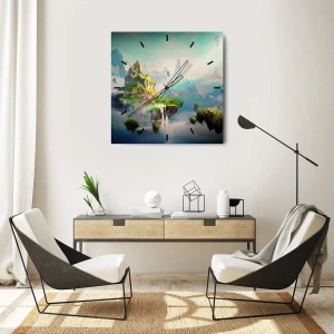 Wanduhr - Glasuhr - Fliegende Inseln zwischen den Wolken mit einem Regenbogen am Horizont - 30x30cm - Mitten am Himmel - glückliche Inseln - Moderne Wanddekoration für Wohnzimmer und Schlafzimmer ARTTOR