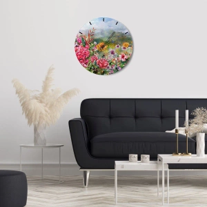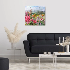 Wanduhr - Glasuhr - Eine farbenfrohe Blumenkomposition vor einem pastellfarbenen Landschaftshintergrund - 30x30cm - Ein Garten, der verrückt geworden ist - Moderne Wanddekoration für Wohnzimmer und Schlafzimmer ARTTOR