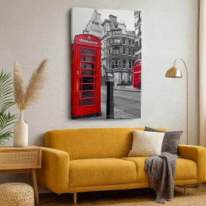 Bild auf Leinwand - Leinwandbild - Eine rote Telefonzelle und ein Doppeldeckerbus in London mit der Stadt im Hintergrund - 50x70cm - Das Rotste in Europa - Moderne Wanddekoration für Wohnzimmer und Schlafzimmer ARTTOR