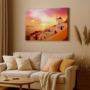 Bild auf Leinwand - Leinwandbild - Santorini bei Sonnenuntergang mit einer Windmühle - 50x70cm - In Weiß und Gold schmelzen - Moderne Wanddekoration für Wohnzimmer und Schlafzimmer ARTTOR