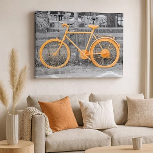 Bild auf Leinwand - Leinwandbild - Künstlerische Fotografie eines gelben Fahrrads vor einem schwarz-weißen Hintergrund - 50x70cm - Geh, ich warte hier - Moderne Wanddekoration für Wohnzimmer und Schlafzimmer ARTTOR