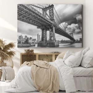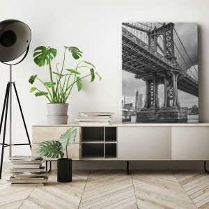 Bild auf Leinwand - Leinwandbild - Eine Brücke in Schwarz-Weiß mit Blick auf die Stadt - 50x70cm - Ins Herz der Stadt - Moderne Wanddekoration für Wohnzimmer und Schlafzimmer ARTTOR