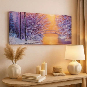 Bild auf Leinwand - Leinwandbild - Winterlandschaft mit Brücke und Sonnenuntergang - 50x70cm - Treffen wir uns hier - Moderne Wanddekoration für Wohnzimmer und Schlafzimmer ARTTOR