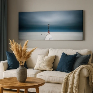 Bild auf Leinwand - Leinwandbild - Ein Leuchtturm am Ende eines Betonpfeilers in einer kargen Landschaft - 50x70cm - Um der Weite zu begegnen - Moderne Wanddekoration für Wohnzimmer und Schlafzimmer ARTTOR