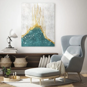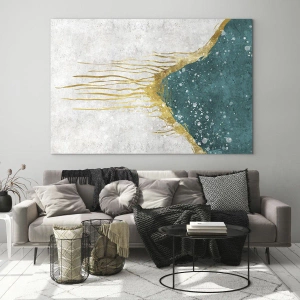 Glasbild - Bild auf glas - Abstraktes Goldmuster auf türkis-weißem Hintergrund - 50x70cm - Goldene Flut - Moderne Wanddekoration für Wohnzimmer und Schlafzimmer ARTTOR