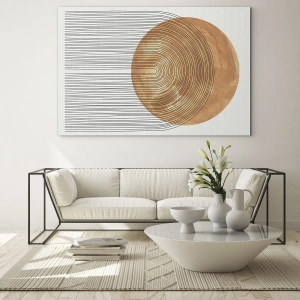 Das Gemälde ist in hellen Tönen gehalten, mit einem klaren Kontrast zwischen dem goldenen Kreis und den dünnen, schwarzen Linien. Die minimalistische Farbgebung und die geometrische Anordnung machen es zur perfekten Ergänzung für skandinavische, moderne und Loft-Stile. Die Komposition überwältigt den Raum nicht, setzt aber einen interessanten Akzent und kann als zentrale Dekoration im Raum dienen. Dank der präzisen Verarbeitung verleihen die Linien dem Gemälde Tiefe und einen dynamischen Rhythmus.