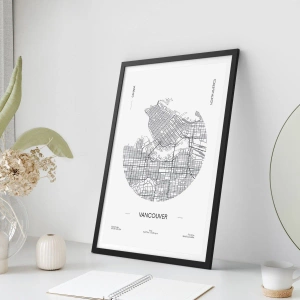 Poster in einem schwarzem Rahmen - Eine Karte von Vancouver im minimalistischen Schwarz-Weiß-Stil - 70x50cm - Anatomie von Vacouver - Moderne Wanddekoration für Wohnzimmer und Schlafzimmer ARTTOR