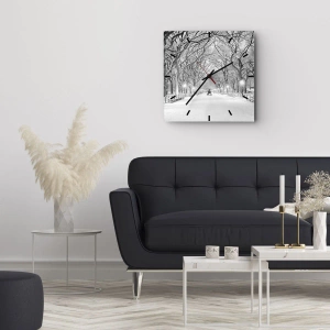 Wanduhr - Glasuhr - Eine Winterallee mit schneebedeckten Bäumen in Monochrom - 30x30cm - Vier Jahreszeiten - Winter - Moderne Wanddekoration für Wohnzimmer und Schlafzimmer ARTTOR