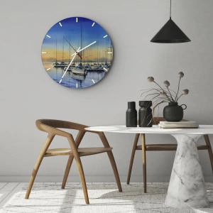 Die Wanduhr „Das Ende eines guten Tages“ ist ein einzigartiges Angebot für Liebhaber gemalter Landschaften und stimmungsvoller Ansichten. Das Zifferblatt zeigt einen ruhigen Hafen voller vertäuter Segelboote, die sich in der Oberfläche des stillen Wassers spiegeln. Der Himmel, beleuchtet von den warmen Tönen der untergehenden Sonne, wechselt sanft von Blau zu Pastell-Orange und schafft so eine harmonische Landschaft.