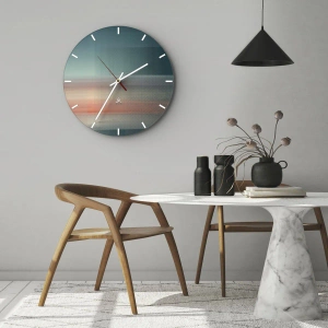 Abstraktion: Lichtwellen“ ist eine moderne Wanduhr mit einer außergewöhnlich ruhigen und subtilen Ästhetik. Das Zifferblatt zeigt ein abstraktes Motiv, das an Lichtwellen erinnert – verschwommene Farbbänder erzeugen den Effekt eines harmonischen Übergangs.