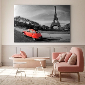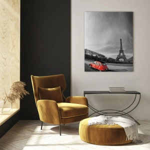 Glasbild - Bild auf glas - Ein rotes Auto mit dem Eiffelturm im Hintergrund in einer schwarz-weißen Umgebung - 50x70cm - Pariser als Paris selbst - Moderne Wanddekoration für Wohnzimmer und Schlafzimmer ARTTOR