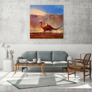 Glasbild - Bild auf glas - Eine Fantasielandschaft mit einem Reiter auf einem prähistorischen Wesen - 50x70cm - Wenn sie nicht ausgestorben wären - Moderne Wanddekoration für Wohnzimmer und Schlafzimmer ARTTOR