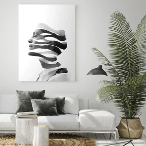 - Ein einzigartiges abstraktes Frauenporträt, bei dem das Gesicht mit geometrischen Streifen verschmilzt. Die Schwarz-Weiß-Ästhetik verleiht der Komposition Geheimnis und Eleganz und unterstreicht den modernen Charakter.