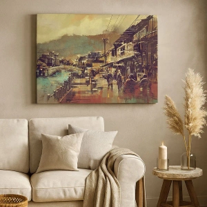 Die Leinwand wird über den Rahmen gespannt. Die Seiten und Kanten werden gedruckt, um das Bild fortzusetzen. Das Bild ist fertig zum Aufhängen an der Wand. Jedes Produkt hat einen am Rahmen befestigten Anhänger und ein Montageset (Schraube + Stift).