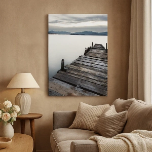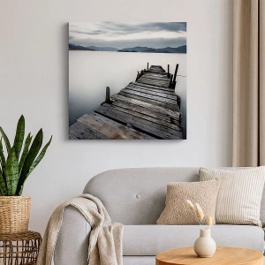 • Ein Holzsteg führt zu einem ruhigen See. Eine ideale Dekoration für naturinspirierte Innenräume, die Harmonie und Entspannung bringt. Perfekt für Wohnzimmer, Schlafzimmer und Loungebereiche.