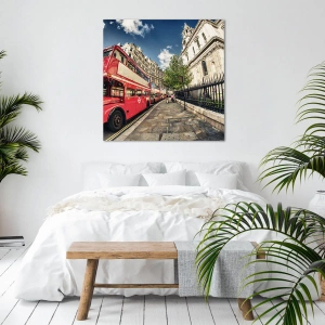 Bild auf Leinwand - Leinwandbild - Roter Doppeldeckerbus in London in der Nähe der Straße und der Kathedrale - 50x70cm - Londoner Straße in Grau und Rot - Moderne Wanddekoration für Wohnzimmer und Schlafzimmer ARTTOR