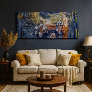 Bild auf Leinwand - Leinwandbild - Eine Frau in einem eleganten Kleid neben einem Retro-Auto in der Nacht - 50x70cm - Nocturne in Blau und Koralle - Moderne Wanddekoration für Wohnzimmer und Schlafzimmer ARTTOR