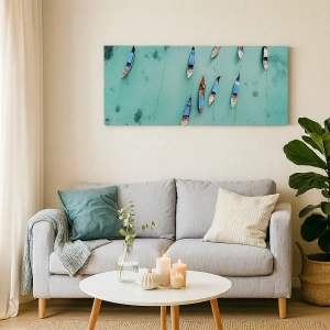Bild auf Leinwand - Leinwandbild - Boote auf türkisfarbenem Wasser aus der Vogelperspektive - 50x70cm - In freudiger Erwartung - Moderne Wanddekoration für Wohnzimmer und Schlafzimmer ARTTOR