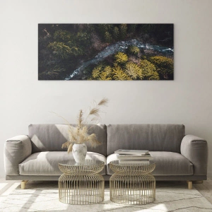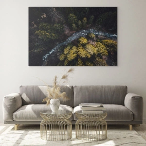 Glasbild - Bild auf glas - Eine Vogelperspektive auf eine Waldlandschaft mit einem gewundenen Bach - 50x70cm - Schnell und immer schneller - Moderne Wanddekoration für Wohnzimmer und Schlafzimmer ARTTOR
