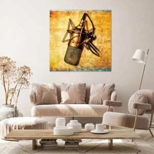 Warme, goldene Farbtöne und die künstlerische Textur des Hintergrunds verleihen dem Gemälde einen einzigartigen Charakter. Das Mikrofon symbolisiert die Kunst des Klangs und schafft eine inspirierende Atmosphäre sowohl im Wohnzimmer als auch in professionellen Studioräumen. Perfekt für Musiker, Sänger und Audio-Enthusiasten.