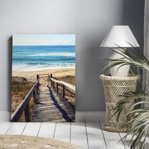 - Dieses Gemälde zeigt einen Holzweg, der zu einem Strand am azurblauen Meer führt. Perfekt für Naturliebhaber, bringt es eine ruhige und sommerliche Atmosphäre in jedes Interieur.