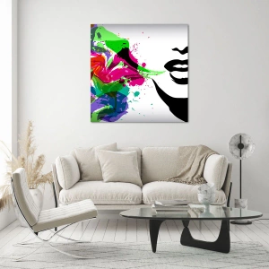 Glasbild - Bild auf glas - Eine farbenfrohe Abstraktion mit einem weiblichen Profil und Farbtupfern. - 50x70cm - Eine Geschichte in den Farben des Regenbogens - Moderne Wanddekoration für Wohnzimmer und Schlafzimmer ARTTOR