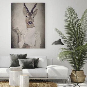 Der Glaskunstdruck „Lass die Gesten sprechen“ ist ein einzigartiges Werk, das Surrealismus mit modernem Stil verbindet. Es zeigt drei Tierfiguren – ein Zebra, ein Reh und einen Elch – in Menschenkleidung, wodurch eine faszinierende und humorvolle Komposition entsteht. Der neutrale Hintergrund unterstreicht die Ausdruckskraft jeder Figur und verleiht dem Bild Eleganz und künstlerischen Ausdruck.