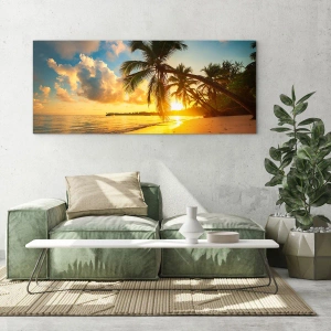 Glasbild - Bild auf glas - Tropischer Strand mit Palmen bei Sonnenuntergang - 70x50cm - Karibischer Traum - Moderne Wanddekoration für Wohnzimmer und Schlafzimmer ARTTOR