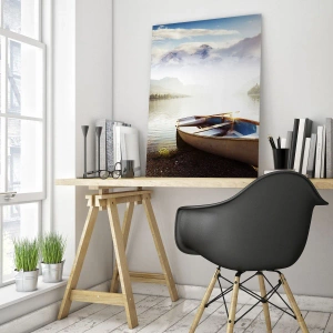 Glasbild - Bild auf glas - Ein Boot auf einem See, umgeben von Bergen bei Sonnenaufgang - 100x70cm - Am tollen und klaren Wasser - Moderne Wanddekoration für Wohnzimmer und Schlafzimmer ARTTOR