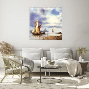 Glasbild - Bild auf glas - Segelboote auf einem ruhigen See mit Windmühlen im Hintergrund - 70x50cm - Die Rückkehr der Seeleute - Moderne Wanddekoration für Wohnzimmer und Schlafzimmer ARTTOR