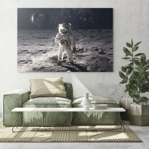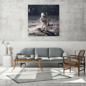 Glasbild - Bild auf glas - Astronaut auf der Mondoberfläche mit der Erde im Hintergrund - 50x70cm - Grüße vom Mond - Moderne Wanddekoration für Wohnzimmer und Schlafzimmer ARTTOR
