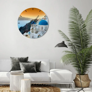- Eine Wanduhr mit einer malerischen Ansicht von Santorin bei Sonnenuntergang. Weiße Gebäude mit blauen Kuppeln bilden zusammen mit dem Meer und dem warmen Himmel eine harmonische Landschaft.