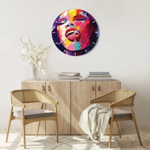 - Diese runde Wanduhr im Format 30 x 30 cm zeigt das farbenfrohe Porträt einer singenden Figur im abstrakten Stil. Perfekt für künstlerische und moderne Innenräume.