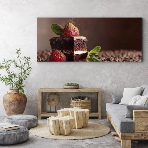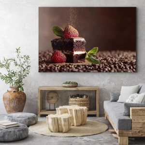 Bild auf Leinwand - Leinwandbild - Schokoladenkuchen mit Himbeeren und Minze auf einem Hintergrund aus Kakaobohnen - 70x50cm - Das Leben ist süß - Moderne Wanddekoration für Wohnzimmer und Schlafzimmer ARTTOR