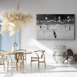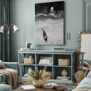 Bild auf Leinwand - Leinwandbild - Schwarz-Weiß-Luftaufnahme von Booten am Strand - 70x50cm - Immer noch am Ufer… - Moderne Wanddekoration für Wohnzimmer und Schlafzimmer ARTTOR