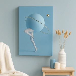 Das 70x50 cm große Leinwandbild im Querformat „And the planets go wild“ vereint ein surrealistisches Motiv und minimalistischen Stil. Die blaue Kugel mit einem umlaufenden Ring und menschlichen Beinen schafft eine außergewöhnliche, futuristische Komposition, die durch ihre Originalität Aufmerksamkeit erregt.